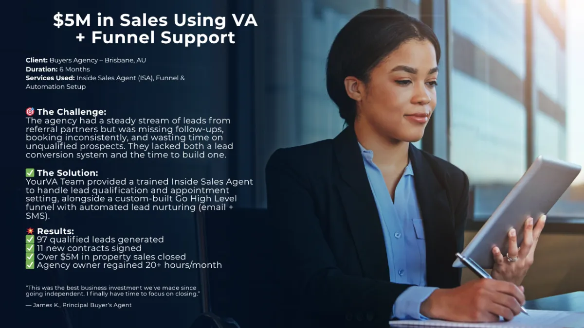 <p>“Before YourVA Team, we were missing follow-ups and losing warm leads. After hiring one of their ISAs, we’ve consistently booked 8–10 property calls per week. It’s like having a full-time assistant without the overhead.”<br> </p>
