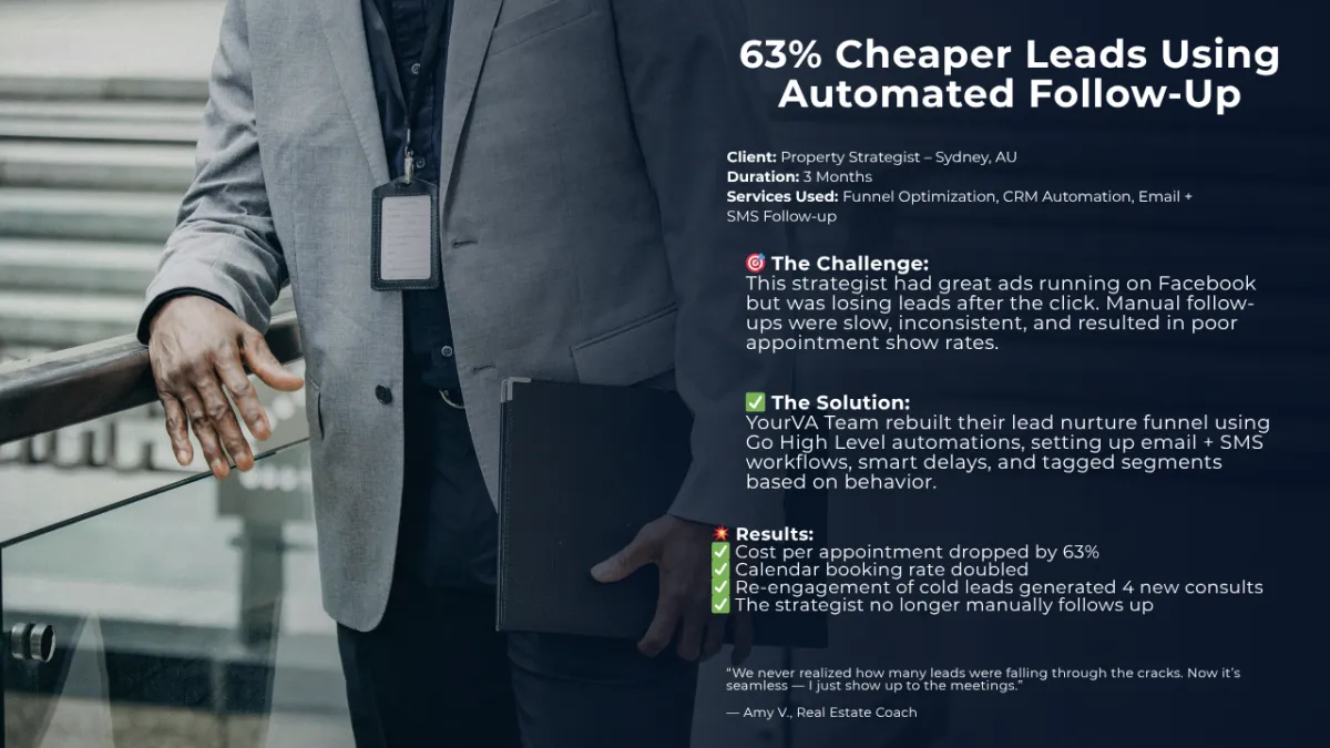“I thought I had a working CRM until YourVA Team stepped in. They rebuilt our entire nurture funnel inside Go High Level, and now our leads actually convert. We went from 2% to over 12% booking rate in just 3 weeks.”